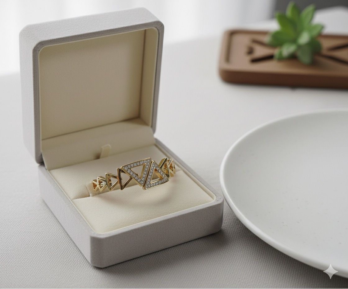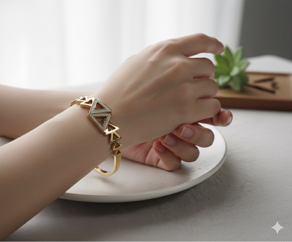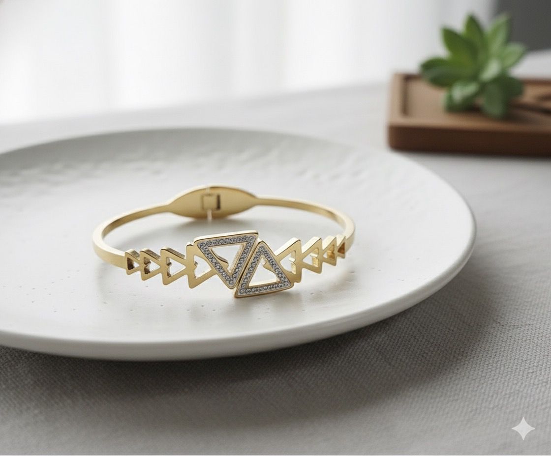 ... Bangle Bracelet, a perfect fusion of modern design and timeless elegance. Crafted in a sleek gold-tone finish, this bangle features a series of interconnected triangle motifs, creating a chic, contemporary look. The centerpiece is adorned with shimmering crystal accents that add a subtle sparkle, elevating your everyday or evening style.